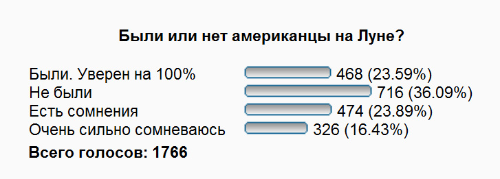 Зашел на форум по указанным ссылкам, взглянул на опрос. Большая часть людей не верит в то, что американцы были на Луне.