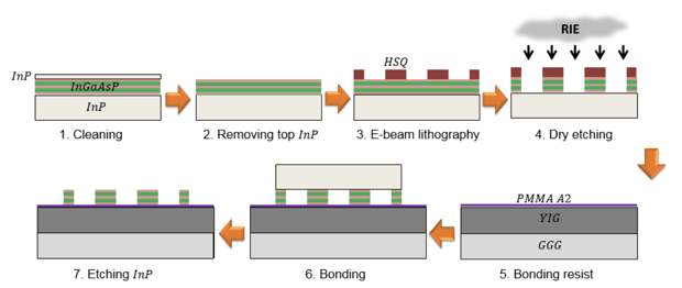 Физики под руководством Бубакара Канте (Boubacar Kanté) из Университета Калифорнии в Сан-Диего смогли получить сразу три когерентных пучка света с орбитальным угловым моментом одновременно. Для этого они нанесли полупроводниковый материал из галлия, индия, фосфора и мышьяка на магнитную подложку. Сначала полупроводниковый слой обработали соляной кислотой, чтобы снять верхний слой, после чего на него поместили заглушки из силсесквиоксана — кремнийорагнического вещества, которое часто применяют в процессах ионной литографии. После этого часть поверхности, не закрытую заглушками, вытравили с помощью реактивной плазмы. Далее с полученного образца удалили заглушки плавиковой кислотой и нанесли его на магнитный слой из иттрий-железного граната. Предварительно на поверхность последнего нанесли защитный полимерный слой, после чего спекали в течение пяти часов при температуре 240 градусов Цельсия при высоком давлении.