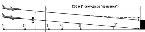 Основана на данных, якобы, бортовых самописцев с той самой самолетки. Запись обрывается за секунду до взрыва, соответственно, при той скорости самолет был на расстоянии 230 метров от здания и на высоте 55 метров над уровнем моря(официальные данные). Здание находится на высоте 12 метров над морем, соответственно, реальная высота его было 43 метра над землей. Угол снижения (официальный по самописцам) - 5 градусов. Фонарные столбы 12 метров высотой. Первый столб был в 330 метрах, последний в 145 метрах от здания. Пофантазируй, каким образом самолет мог сбить эти столбы, получить пробоины и весело распылять керосин над пентагоновской лужайкой.  &-%  Да, тангенс 5 градусов равен 0,0875. Нижняя линия это расчетная высота, на которой самолет мог находится за секунду до того как врубился точно в основание стены, получается 21,1 метра. Тоже высоковато для столбов. Не находишь?  :#*