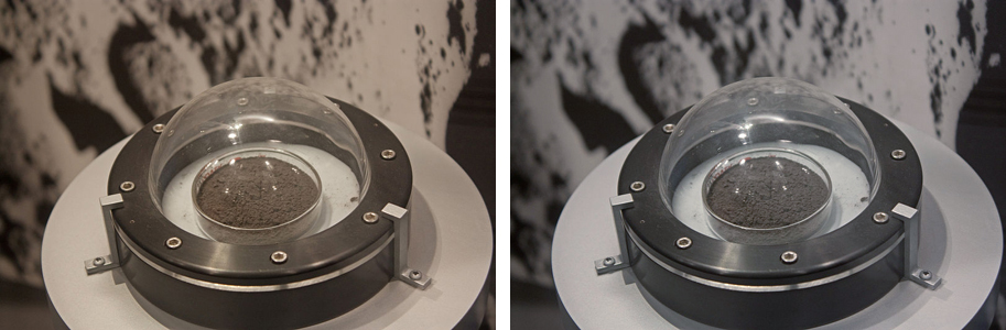 Сегодня причина такого шага может показаться смехотворной, но в конце 60-х никто на Земле не знал ни настоящего цвета лунного грунта, ни того, как выглядит Луна с высоты человеческого роста. В НАСА долго - до последнего дня - гадали и думали, что делать с этой досадной неопределенностью: Сервейер показал серый грунт у опорных тарелок автомата, но на фотках с орбиты Луны поверхность упорно представала пастельно-коричневой. Показывать коричневый было опасно - а вдруг при взгляде с поверхности Луны последняя окажется серой? Показывать коричневые образцы было опасно по тем же причинам. Другое дело серый, то есть, лишенный цветности колер, который в любой момент можно было чуть "утеплить" или "охладить", придать нужное тональное звучание и насыщенность - и превратить серый в какой угодно оттенок, от теплого коричневого до холодного синего или зеленого.