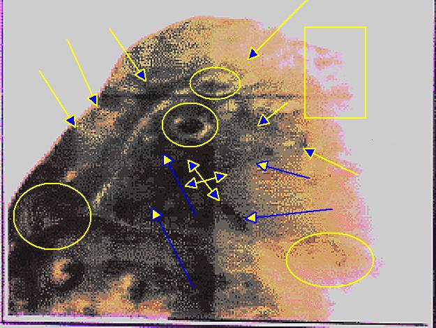 Желтыми стрелками обозначены какие-то устройства в виде пирамид.