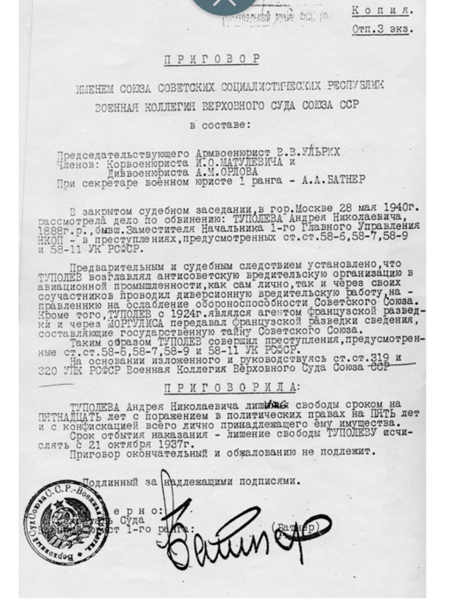 Голимого, убогого трепа, который В.В. Ульрих, И.О. Матулевич, и А.М. Орлов постеснялись вносить в текст приговора, отдав предпочтение более правдоподобному шпионажу в пользу французской разведки, и создание русско-фашисткой партии, во главе с фюрером Туполевым.