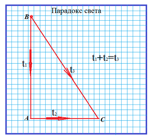 Так вот, время прохождения света из точки В в точку С будет одинаковым, что при траектории по гипотенузе, что при прохождении по катетам...