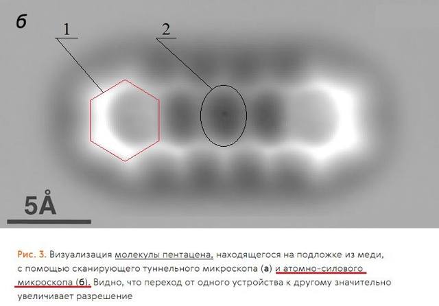 Пентацен — полициклический ароматический углеводород, молекула которого состоит из 5 выстроенных в линию конденсированных бензольных колец. В 2009 году была получена детальная химическая структура молекулы с помощью сканирующего атомно-силового микроскопа. Во время съёмки лежащая на поверхности молекула находилась при температуре 5 K в сверхвысоком вакууме. Используется в качестве полупроводника в пластиковых микросхемах.