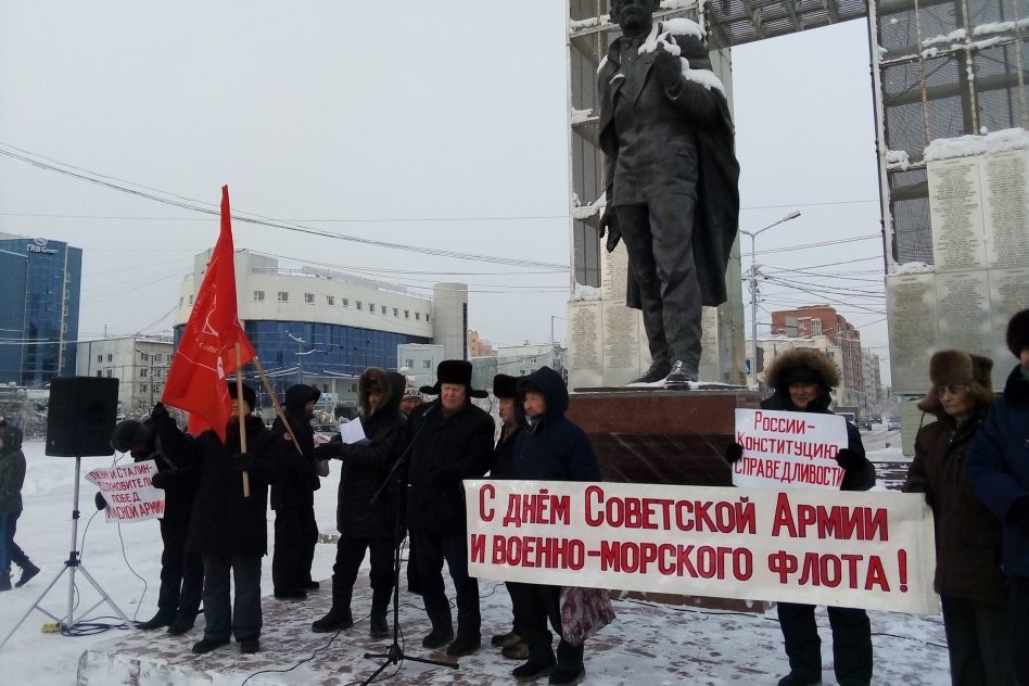 23 февраля на одной из главных площадей города Якутска — площади Орджоникидзе состоялся митинг, посвященный 102-й годовщине со дня создания Красной армии. На акцию пришли около 200 человек — представители Левого Фронта, КПРФ, ОКП, комсомола, движения «Дети войны», неравнодушные граждане. На митинге прозвучали поздравления и выступления ветеранов Советской армии. Было отмечено, что при капитализме и, в особенности, в бытность министром обороны печально известного Сердюкова-Табуреткина боеспособность армии серьезно ослаблена. Пострадали и военная промышленность, и образование, закрыта половина военных училищ.