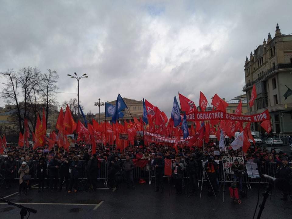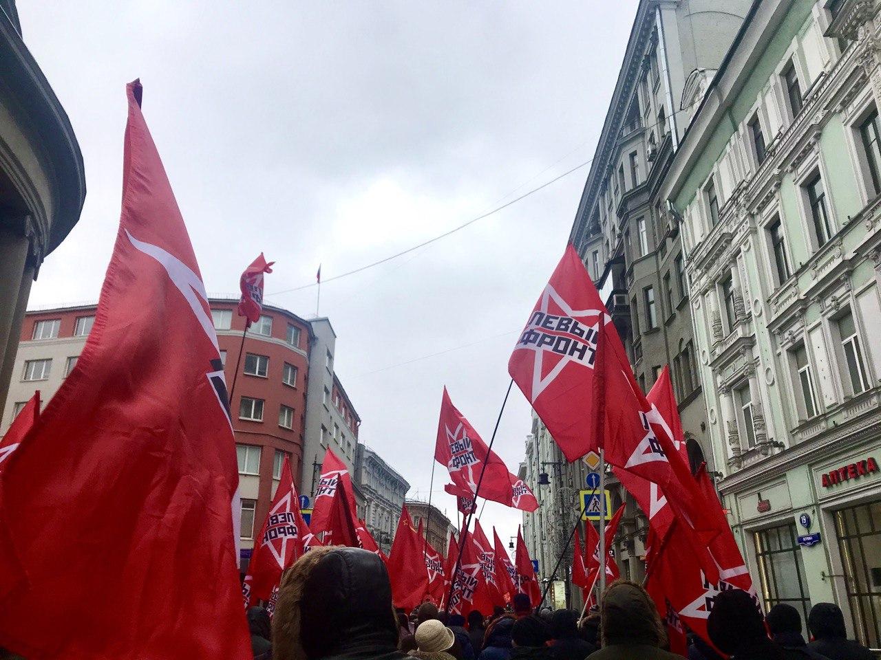 Левый Фронт вышел на шествие под лозунгом «Очистим Россию от барановируса путинизма!», активисты движения несли плакаты: «За социализм и смену власти!», «России нужен левый поворот и новый курс развития!», «За Референдум по Конституции, против узурпации власти!», «За отмену пенсионной реформы!», «Россия без путинизма и капитализма!». По ходу шествия выступали Максим Шевченко, Леонид Развозжаев, гости из регионов. Колонна демонстрантов растянулась по Страстному бульвару и Петровке. Участники шествия дошли до площади Революции, где состоялся митинг, на котором выступили Геннадий Зюганов, Валерий Рашкин, Анастасия Удальцова и другие. Акция завершилась без инцидентов