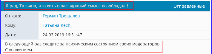 Благо у старшего админа всё же мозги относительно на месте оказались - прищучила своего модератора-идиота.