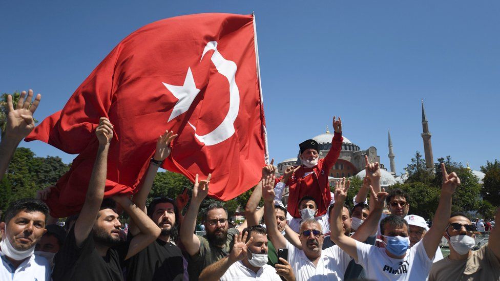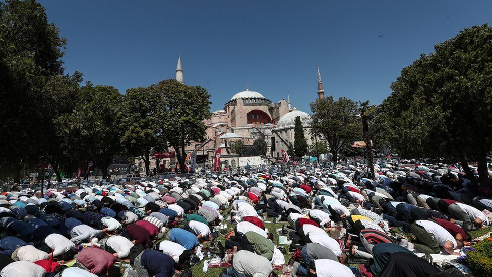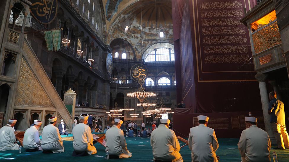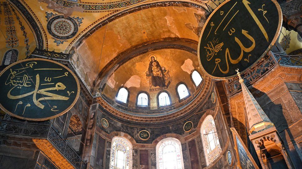 Но, к сожалению, Эрдоган сильно разочаровал ультраконсервативных мусульман - христианские фрески остались внутри мечети Айя-Софья. На время молитвы их просто прикрыли такими вот полотнами, через "пробелы" в которых все было видно. И то не все. Впрочем это было предсказуемо. Никто из ультраконсерваторов и не ожидал от слабого Эрдогана более решительных шагов.