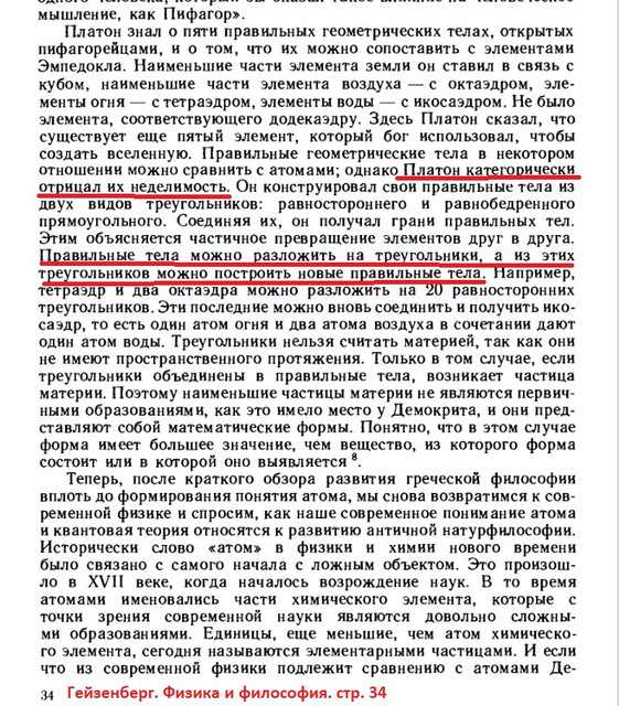 "Современная физика выступает против положения Демокрита и встаёт на сторону Платона, пифагорейцев. Гейзенберг. Физика и философия. стр. 36