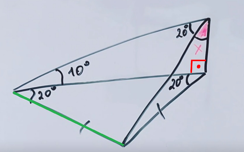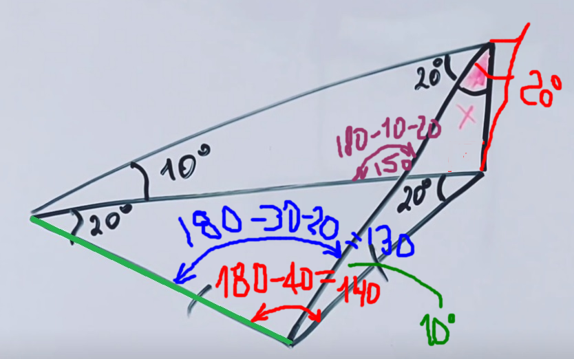 На зелёный отрезок опираются два угла по 20о каждый.