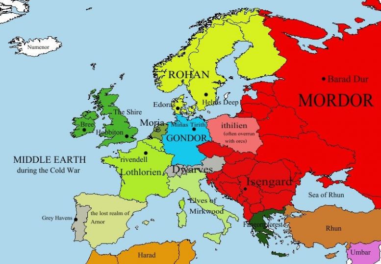 Вот такая забавная карта попалась. намёк более чем прозрачен. Сам Толкин вроде бы категорически отрицал аллегорические связи своих произведений с реальным миром, но вот некоторые поклонники убеждены, что Мордор - это СССР. Ну и пусть, нам нечего стыдиться.