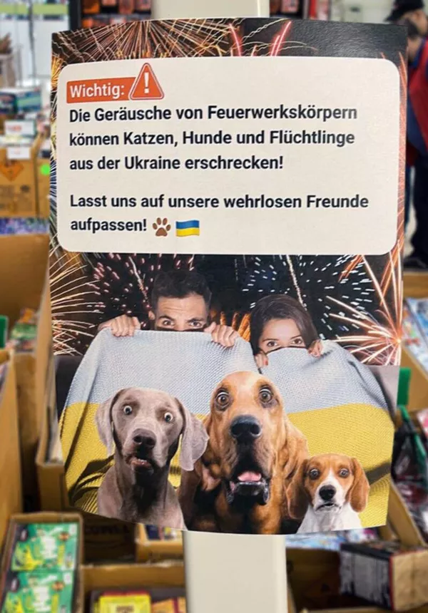 "Важно: звуки фейерверков могут напугать кошек, собак и беженцев из Украины! Давайте позаботимся о наших беззащитных друзьях!" - говорится в предупреждении на листовке.