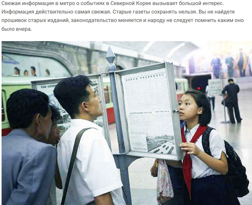 Любая неофициальная информация в стране совершенно вне закона. Тут нет доступа ни к каким иностранным газетам и журналам. Практически нет литературы как таковой, кроме официально одобренных творений современных северокорейских писателей, которые в общем и целом сводятся к восхвалению идей чучхе и великого вождя.