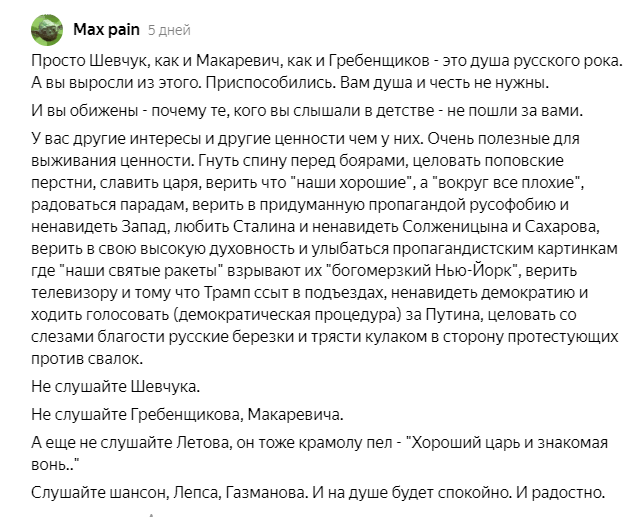 1) Первый подвид сначала снисходительно (видимо, считает себя интеллигентом), в нравоучительном тоне (и даже свысока) витиеватым языком (иногда с издёвкой) начинает журить автора, объяснять в чём он заблуждается , неся обычную капиталистьную белиберду: «диктатура», «гэбэшники», «вечный и обнулённый», «репрессии». Этот вид достаточно образован, часто вежлив.