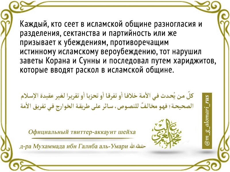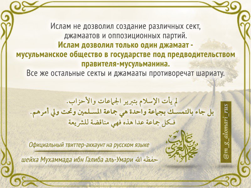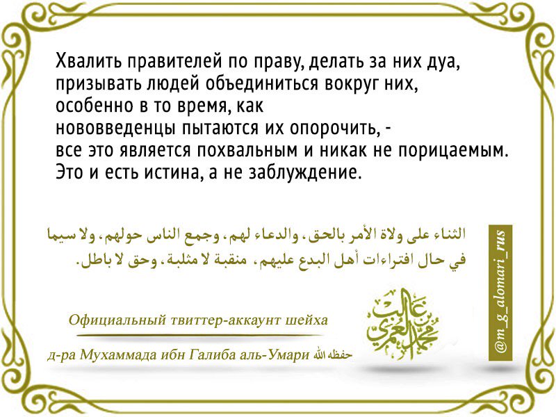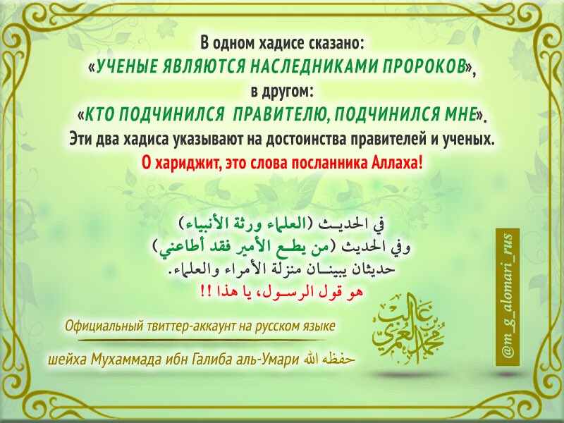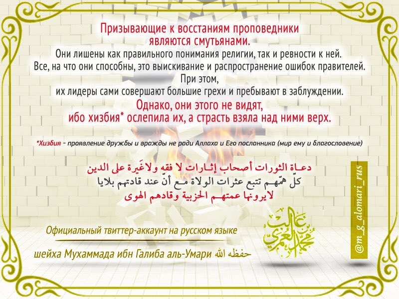 Грязные нечестивцы мурджиитско-мадхалитской секты пытаются сделать все для того, чтобы мусульмане забыли свою героическую историю, которая полна бунтов и восстаний против несправедливых и тиранических правителей, причем против халифов (!). В числе революционеров-оппозиционеров в свое время были даже мать правоверных Айша (мир ей) и внуки Пророка Мухаммада (да благословит его Аллах и приветствует) Хасан и Хусейн (мир им). Они выступали против насправедливых халифов, правителей мусульман которые правили по Шариату. А мерзкие сектанты уверют мусульман, что нужно терпеть и уважать тираническую власть королей, президентов и диктаторов, которые ненавидят Ислам и Шариат и насаждают в мусульманских странах неверие и секуляризм.